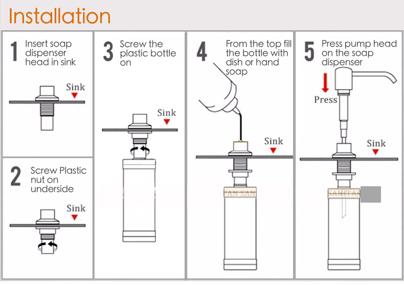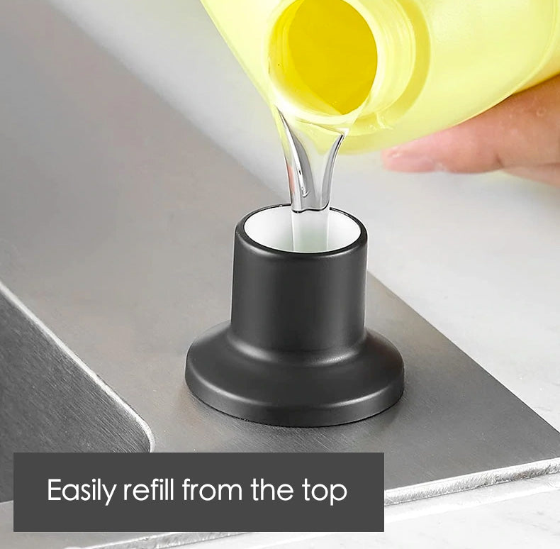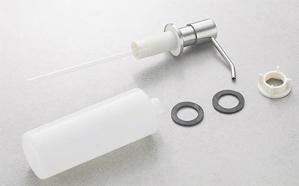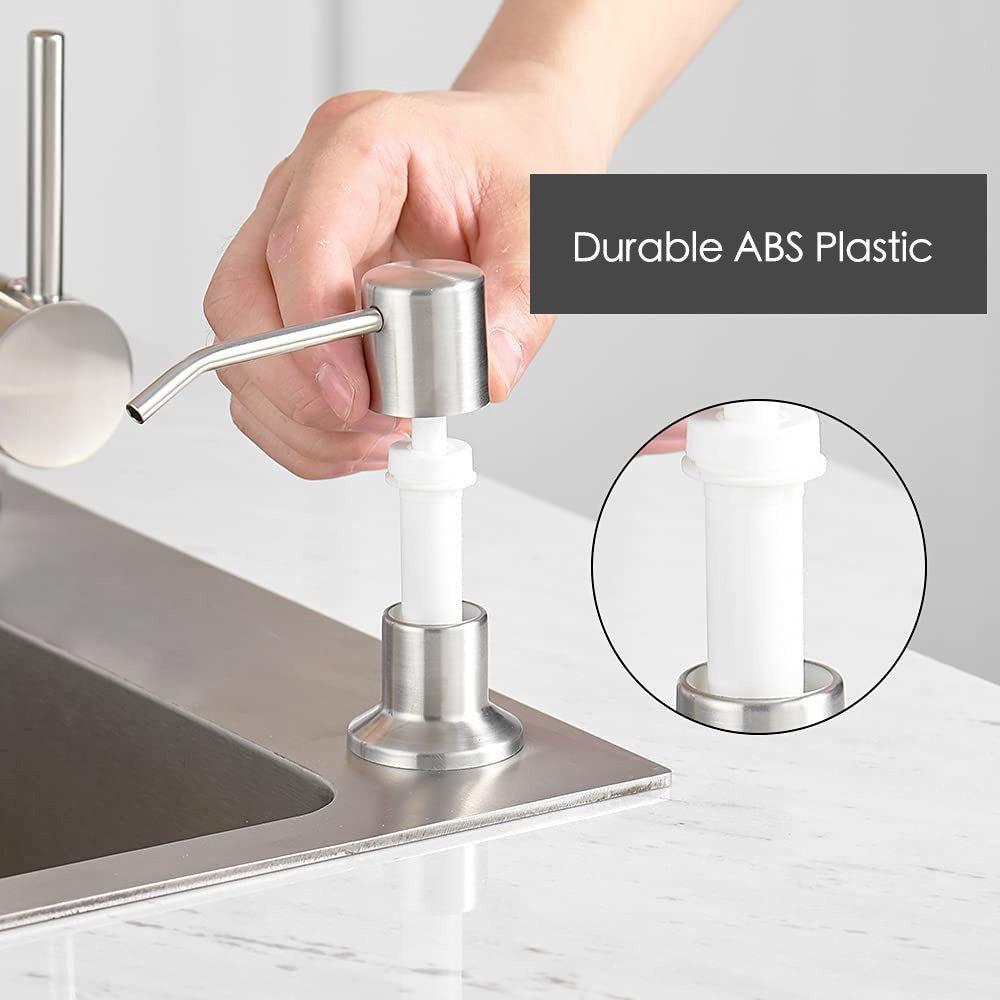 A sink mounted liquid soap dispenser is not only convenient, it gives you another option to fill the holes of your predrilled sink. Our 13.5 ounce capacity soap dispenser is easy to install, easy to refill, and is made of stainless steel and sturdy ABS plastic. Fits hole openings of 1 - 1.5 inches in diameter. Available in black, brushed gold, chrome and nickel.